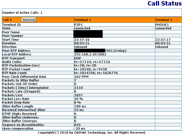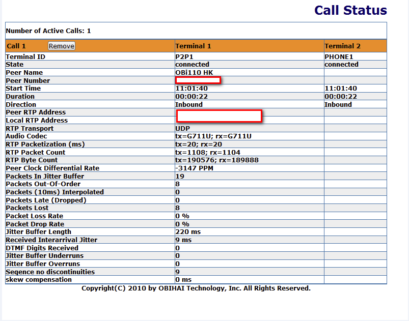 對應角色兄所做測試的 4 種方式,現在把OBi110 Call Status 的Screen Cap 貼出來讓大家參考比較: