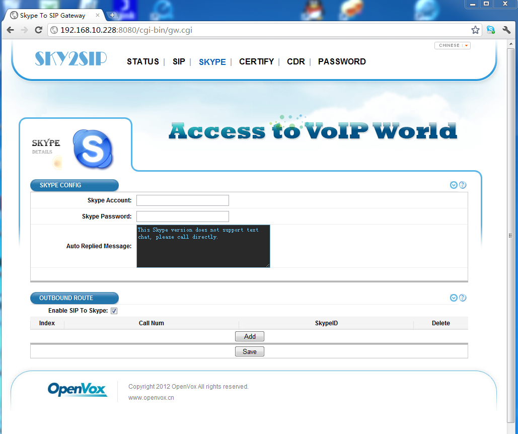 OpenVox Skype to SIP gateway package which deals with old bugs has been updated ,please download it from http://downloads.openvox.cn/pub/ ... SkypetoSipGw.tar.gz