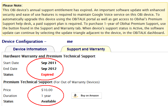 This OBi device's annual support entitlement has expired. An important software update with enhanced security and ease of use features is required to maintain Google Voice service on this OBi device. To automatically upgrade this device using the OBiTALK portal as well as get access to Obihai’s Premium Support help desk, a paid support plan is required. To purchase 1-year of Obihai Premium Support, use the button found in the Support and Warranty tab. When device's support status is Active, the software update can continue by selecting the update triangle adjacent to the device, in the OBiTALK dashboard.
